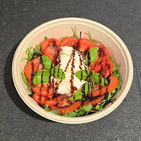mit Rucola, frischen Tomatenscheiben, Mozarella, Olivenöl, Basilikum, Oregano und Crema Balsamico
